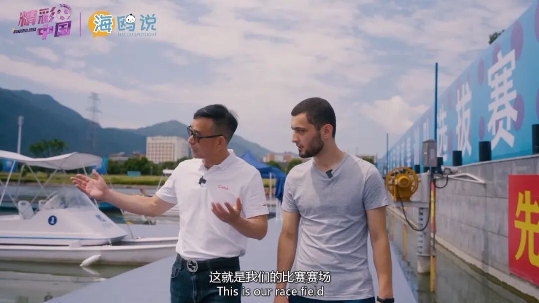看龙舟,到温州!网络国际传播“海鸥圈”成员Alisher(阿里舍,温州医科大学研究生)来到温州龙舟运动中心,在该中心竞赛技术运行副主任王勤铄的带领和解说之下,深入了解亚运龙舟的场馆分布和设计理念。